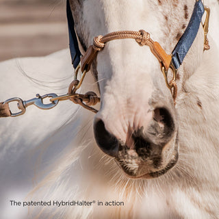 The patented Hybrid Headcollar is a full time replacement headcollar that your horse can wear for every life task.